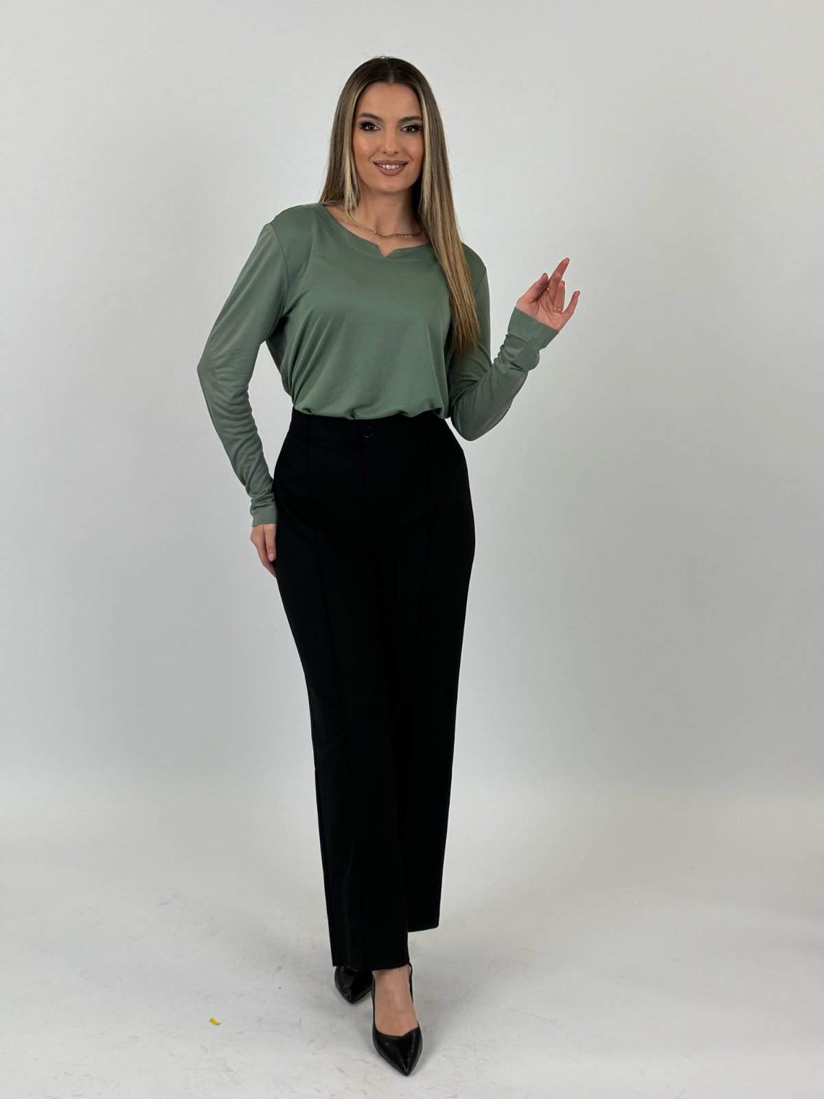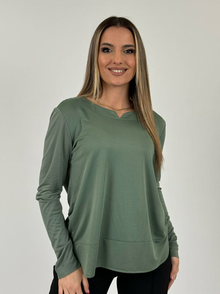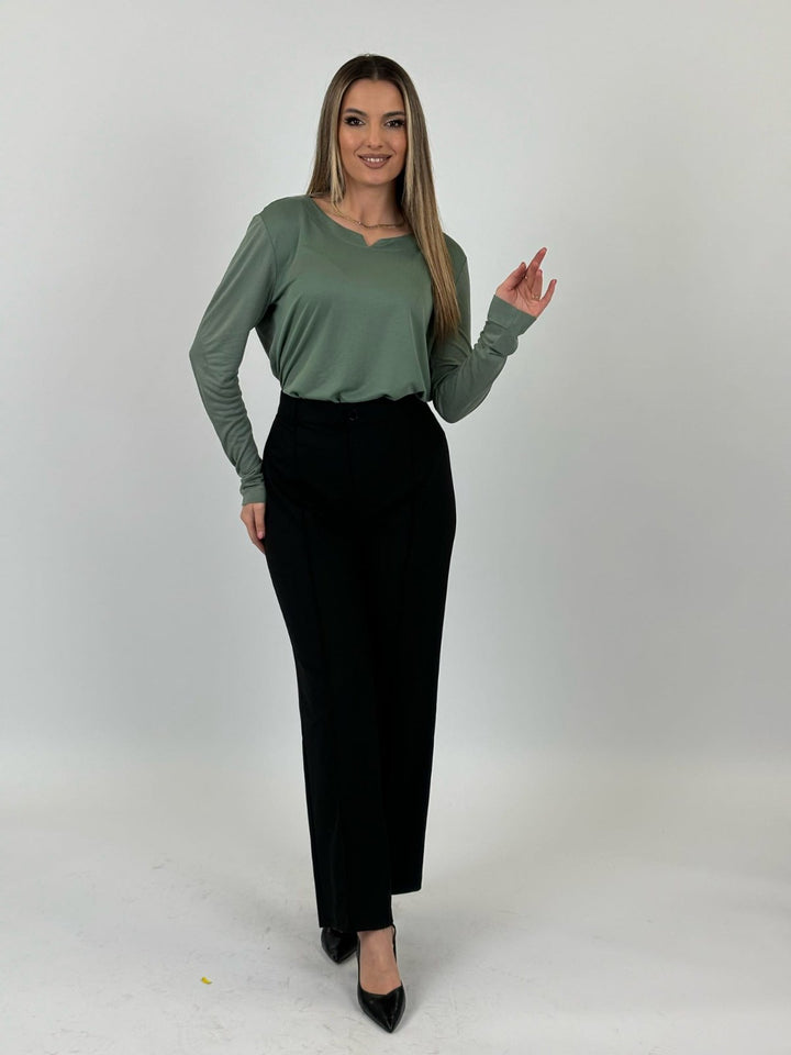 Me një dizajn minimalist dhe një ngjyrë të qetë jeshile, kjo bluzë është zgjidhja perfekte për një pamje të pastër dhe moderne.