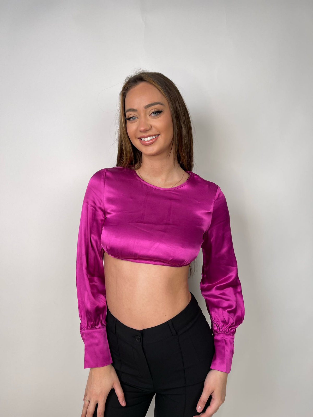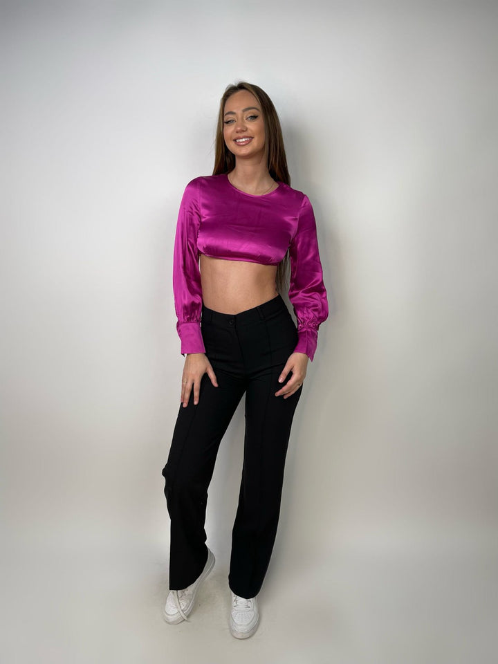 Satin i butë takohet me një dizajn joshës në këtë crop top me ngjyrë magenta. Me mëngë të gjata të fryra dhe një pjesë të pasme të hapur që lidhet me fjongo, kjo bluzë është krijuar për të lënë përshtypje.