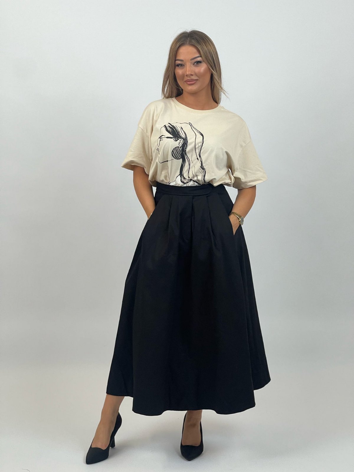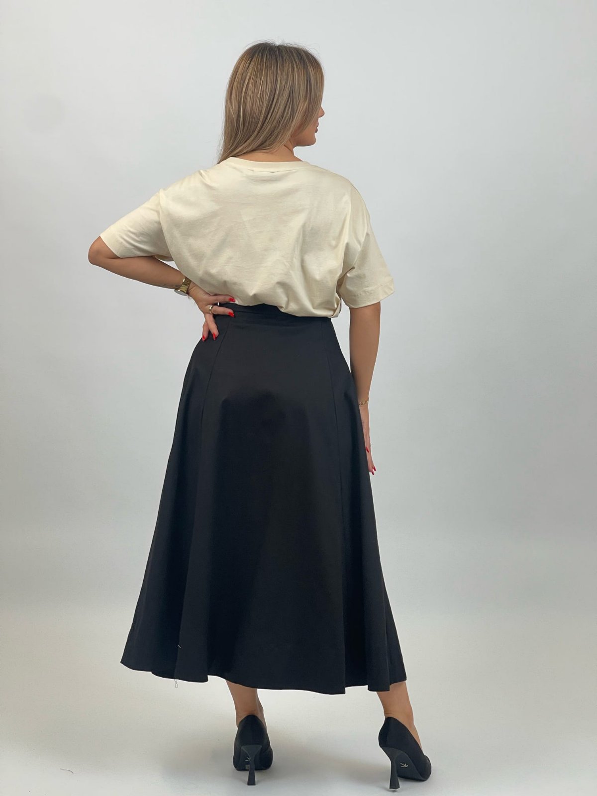 Elegant dhe praktik, ky fund i zi me gjatësi mesatare ofron një pamje të rafinuar, të përshtatshme si për dalje të përditshme ashtu edhe për ambiente formale.