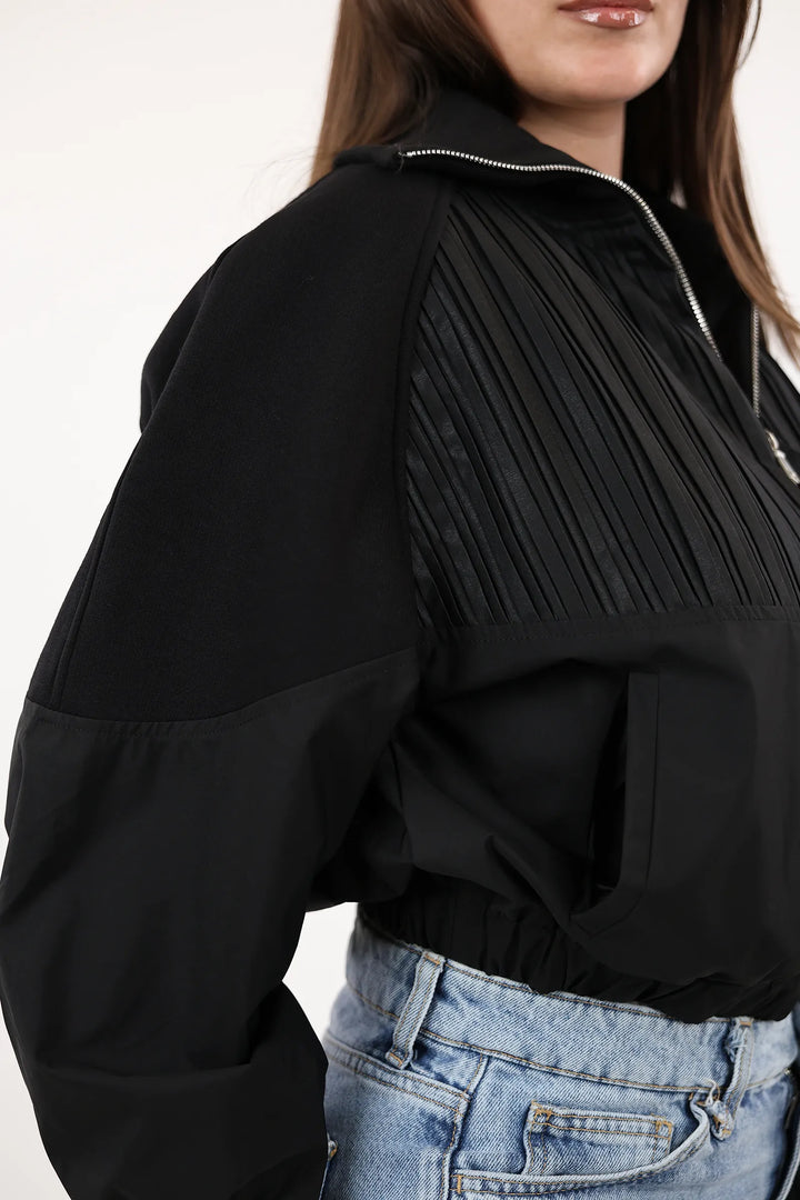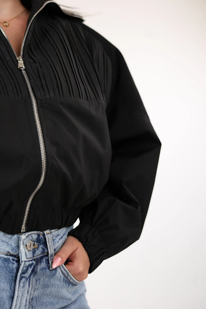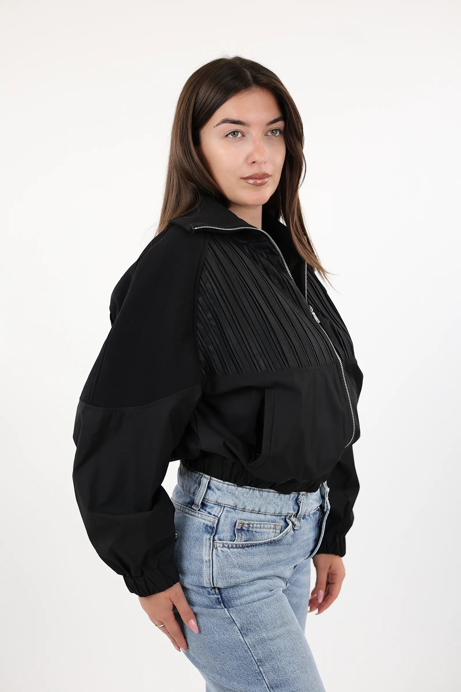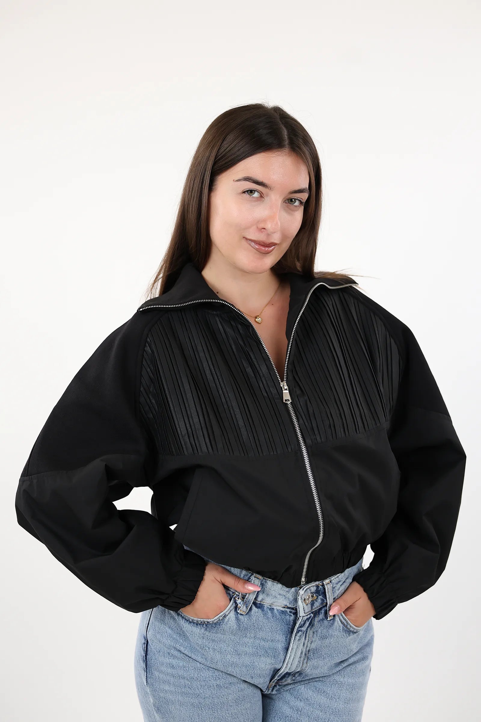 Mantil elegant per femra me zip perpara, dizajn modern dhe funksional per stilin tuaj te perditshem.