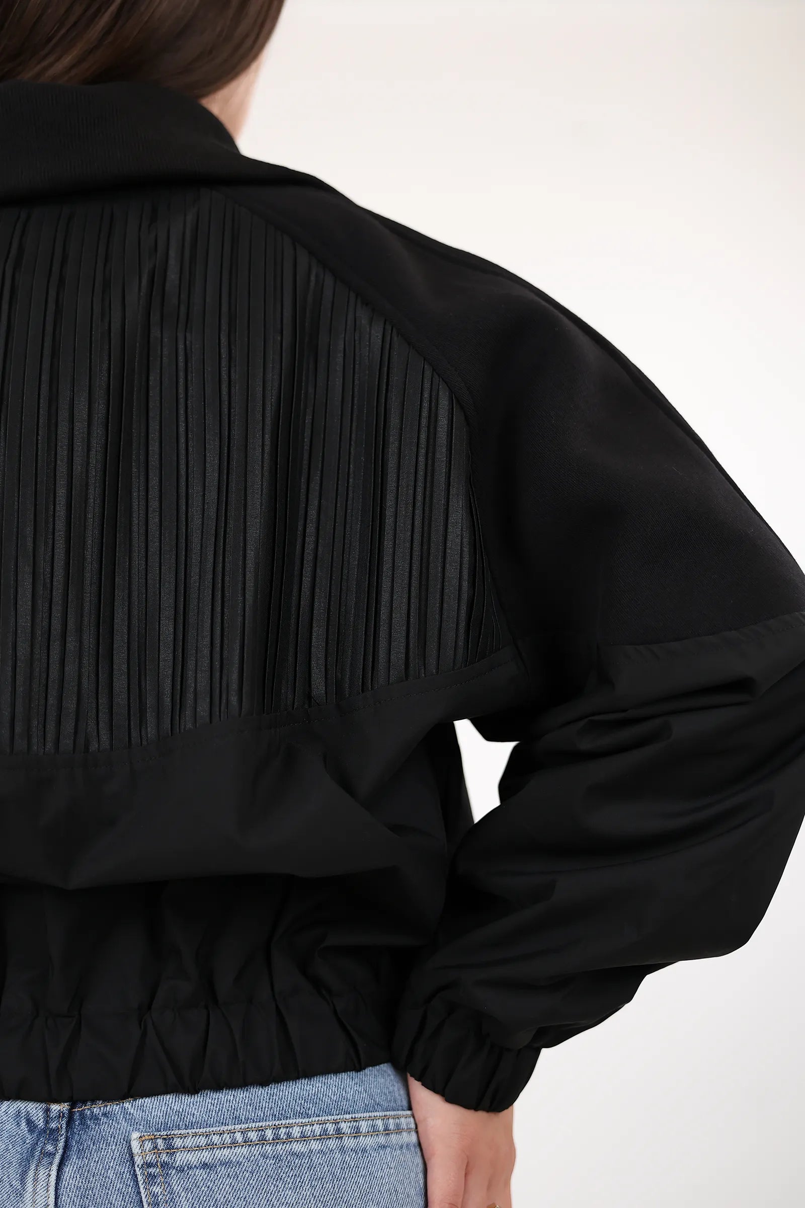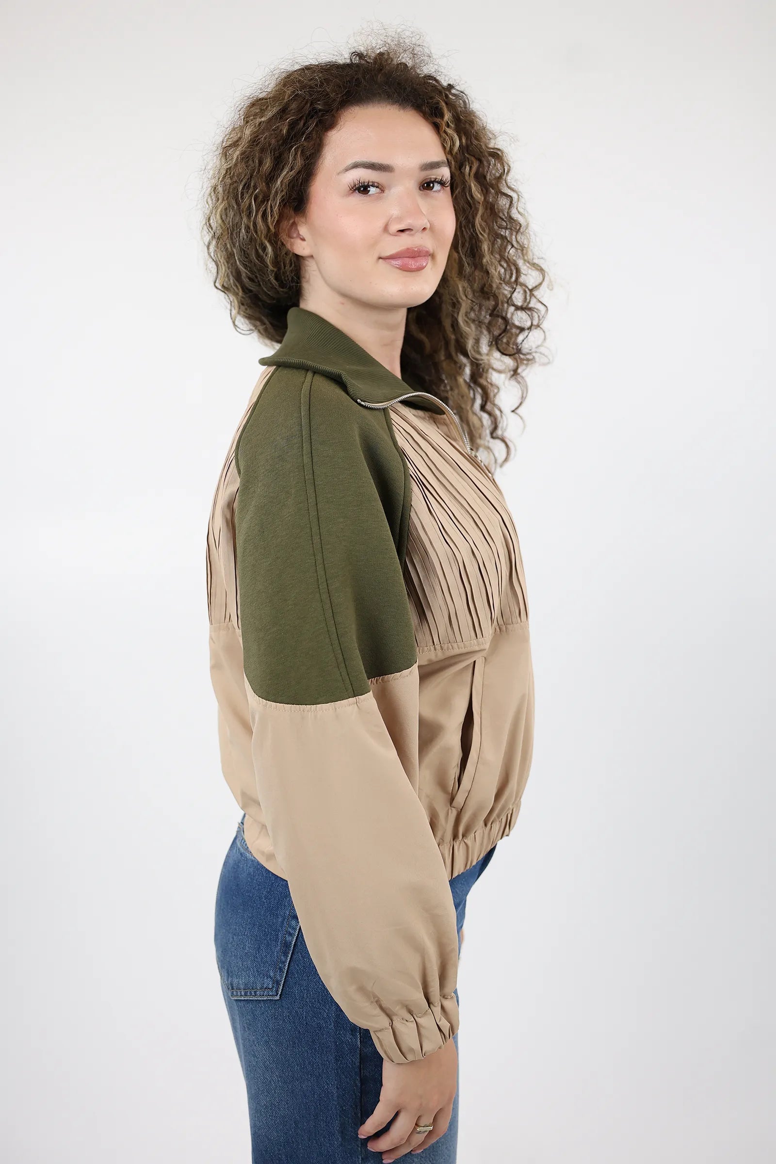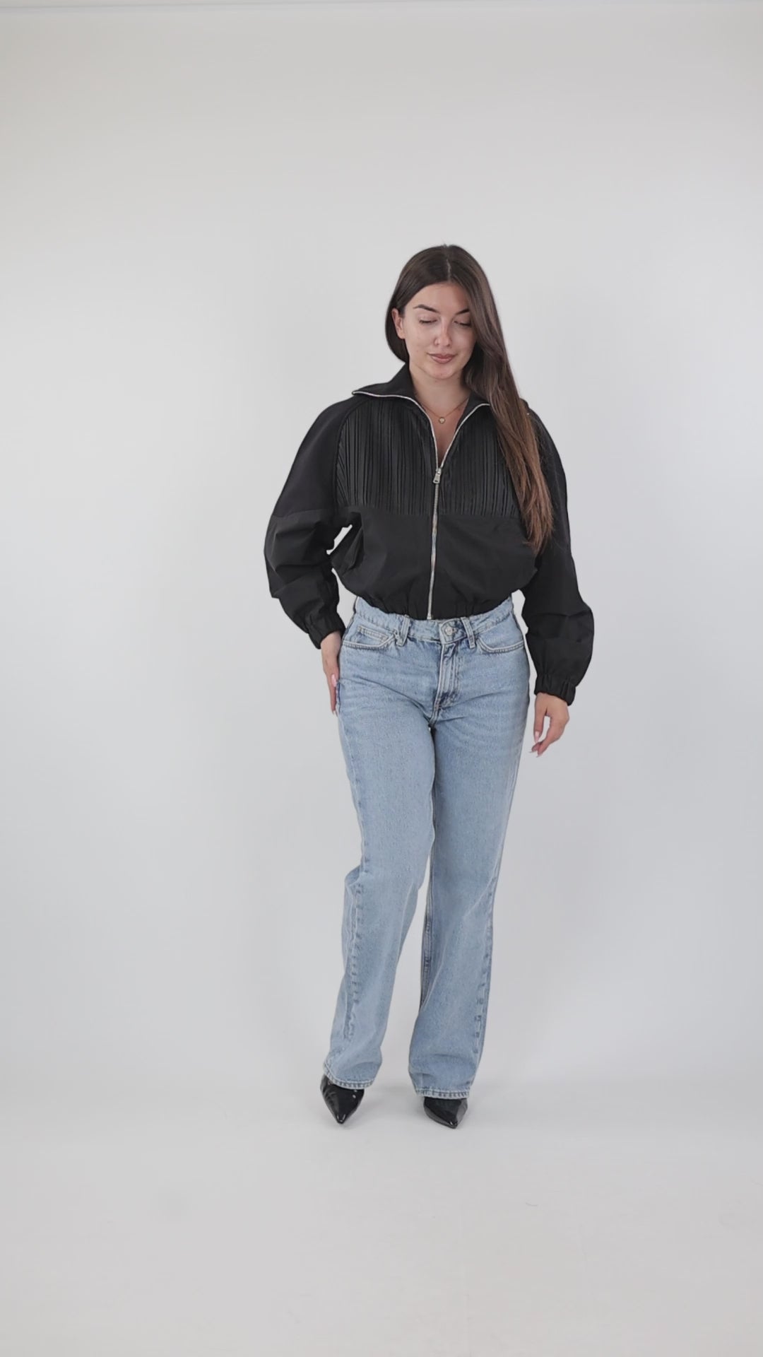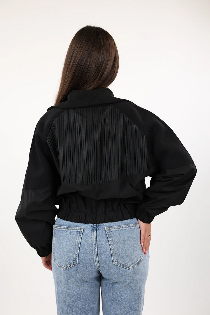 Mantil elegant per femra me zip perpara, dizajn modern dhe funksional per stilin tuaj te perditshem.