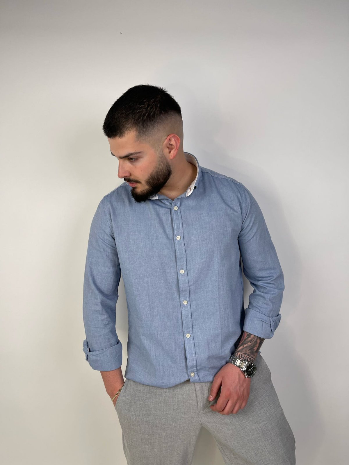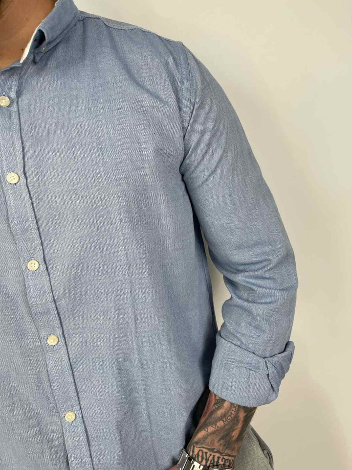 Këmishë blu me mëngë të gjata është pjesa që të nxjerr nga rutina pa u munduar fare.