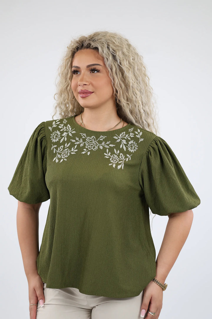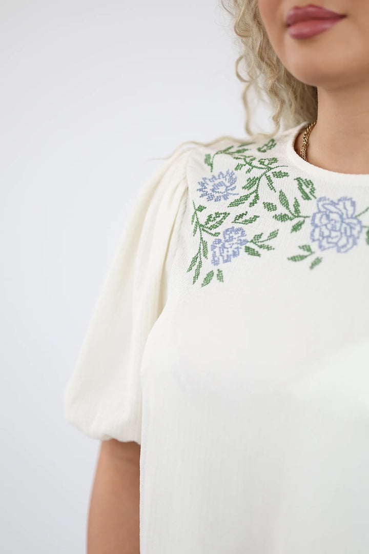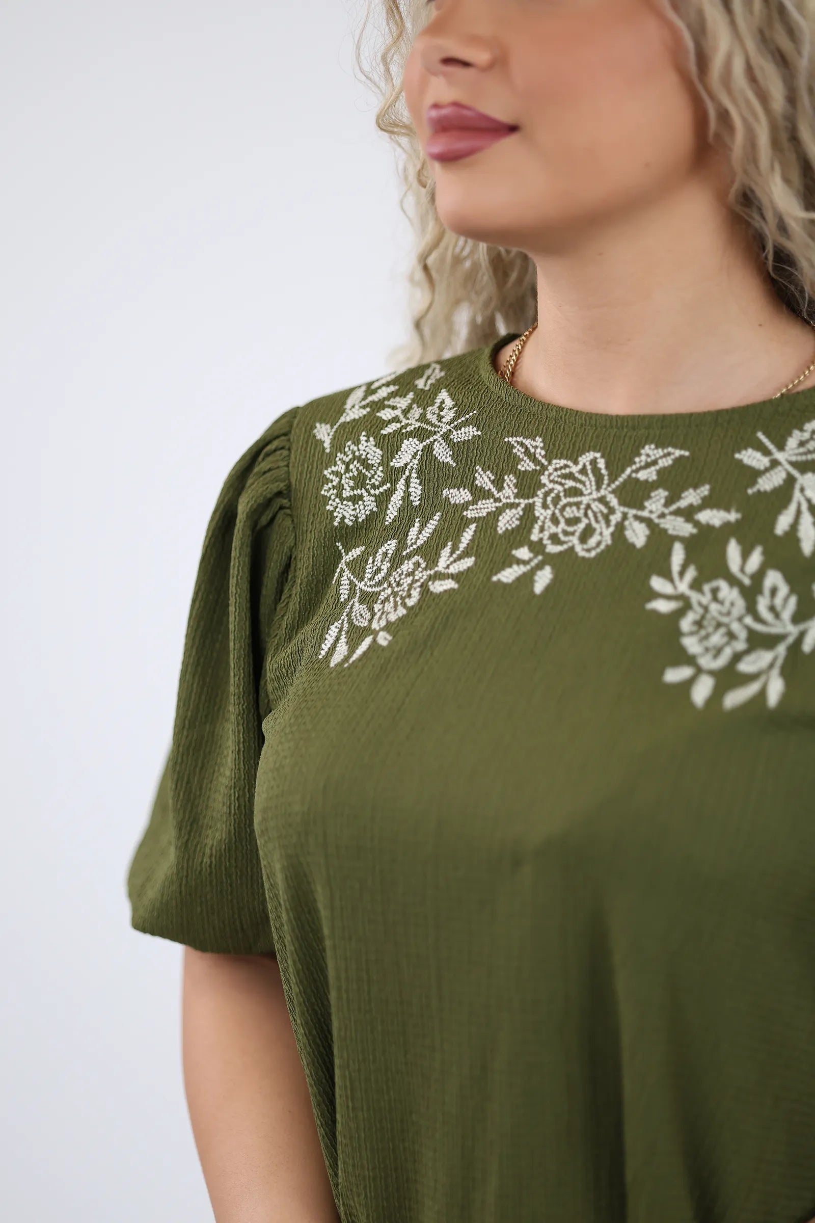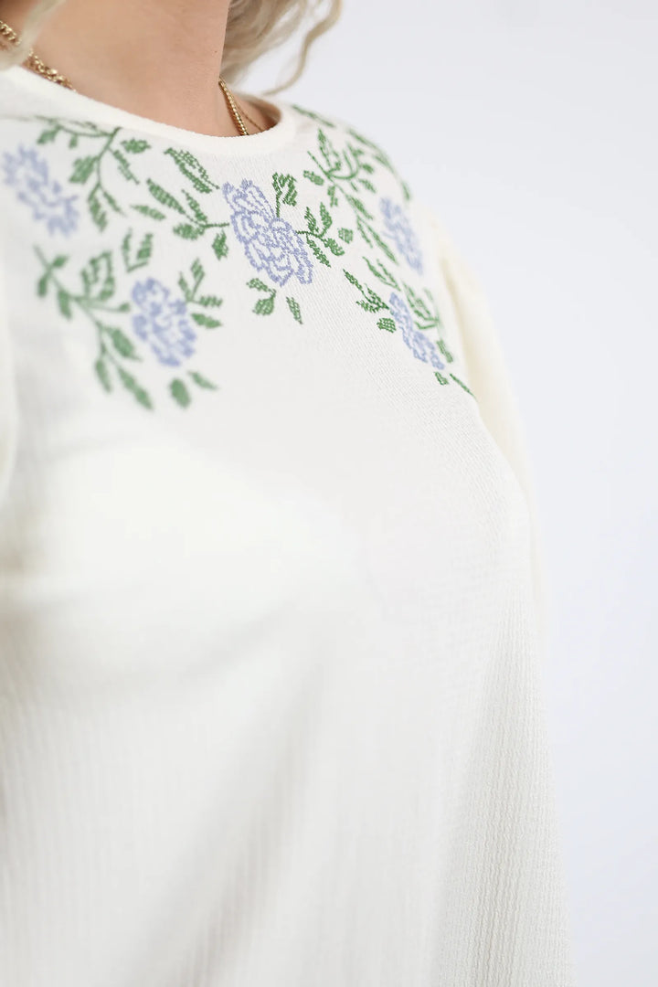 E dekoruar me qëndisje delikate me motive lulesh në pjesën e sipërme, kombinon thjeshtësinë me elegancën.