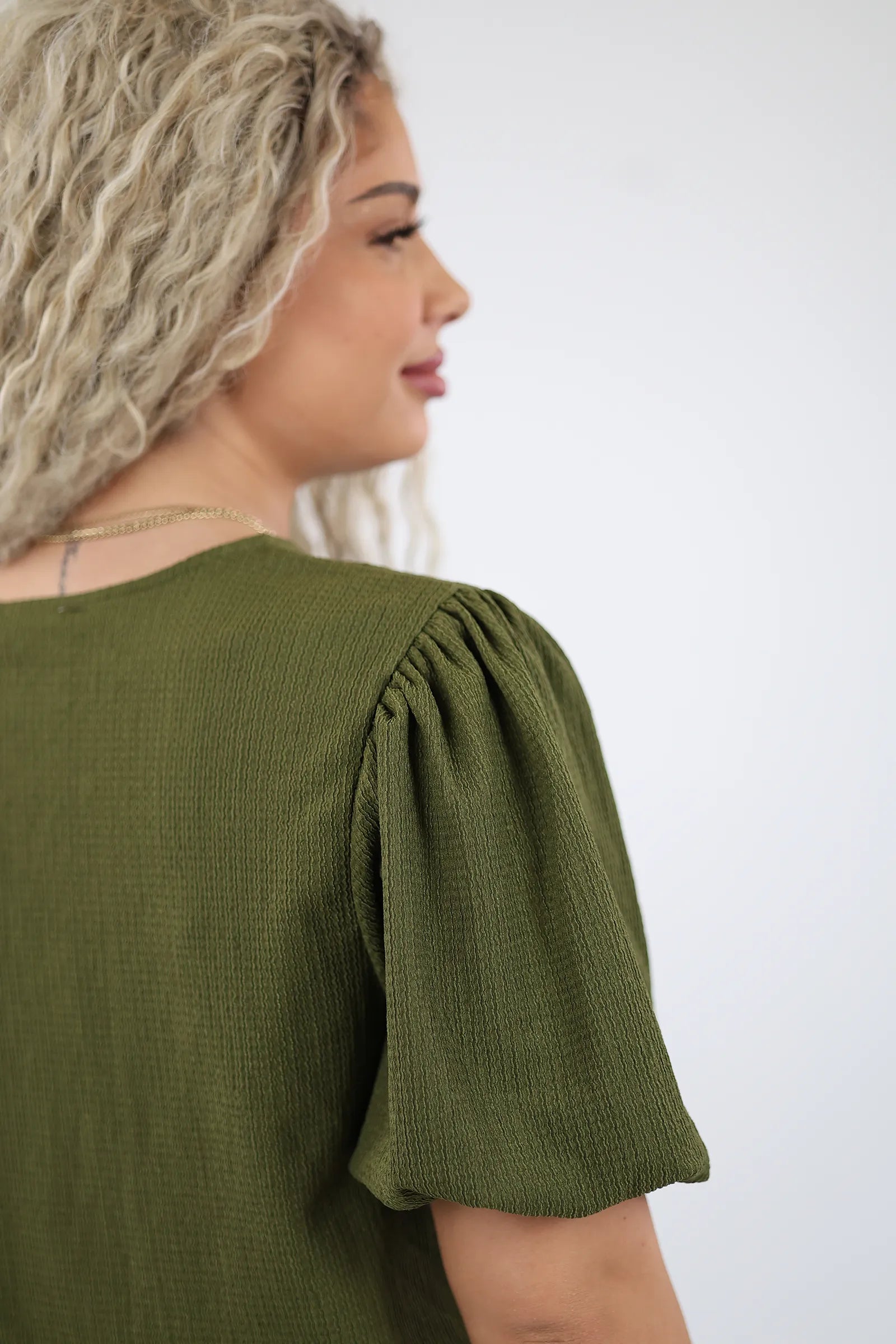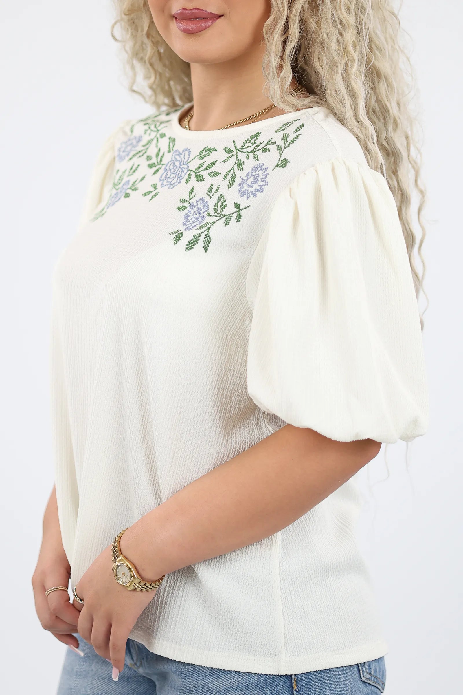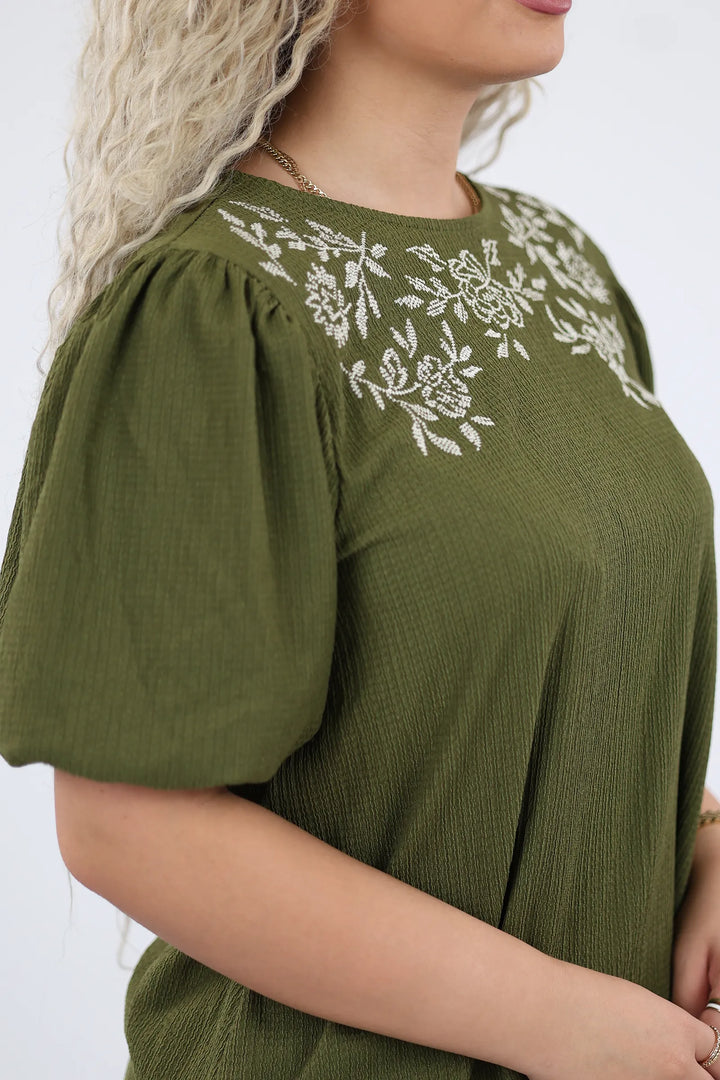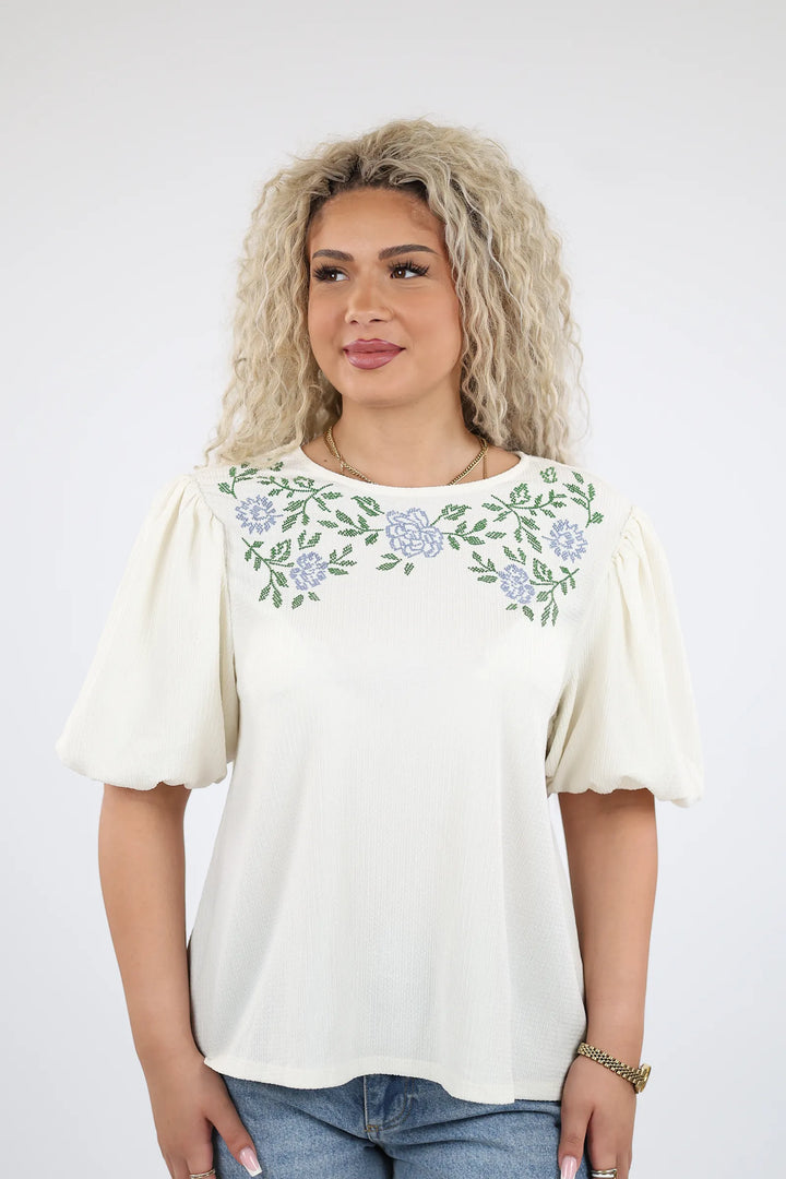 E dekoruar me qëndisje delikate me motive lulesh në pjesën e sipërme, kombinon thjeshtësinë me elegancën.